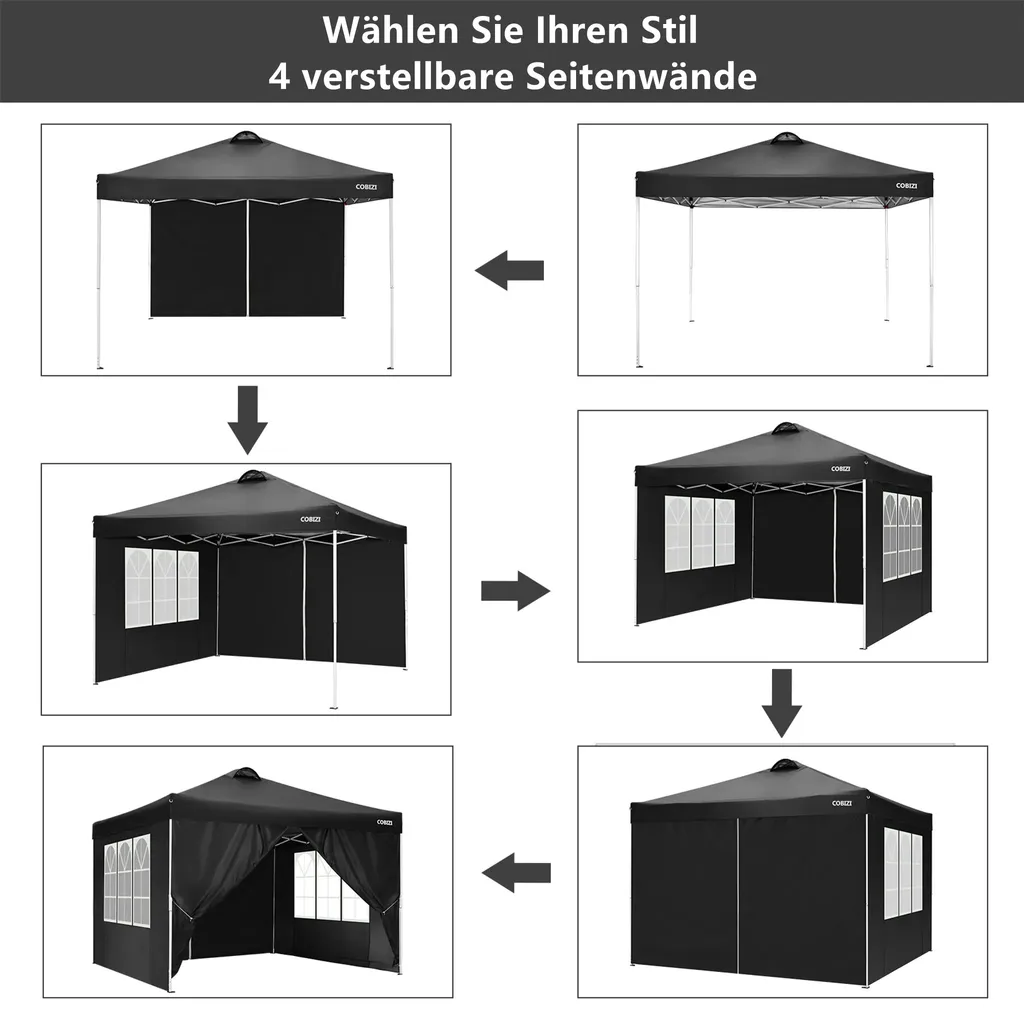 COBIZI Pavillon 3x3m Pop Up Faltpavillon Mit 4 Seitenwänden, Oben Mit Belüftungsloch, Wasserdicht, UV-Schutz 50+ Gartenzelt Partyzelt, Inkl .Tasche, 4 Sandsack, Schwarz