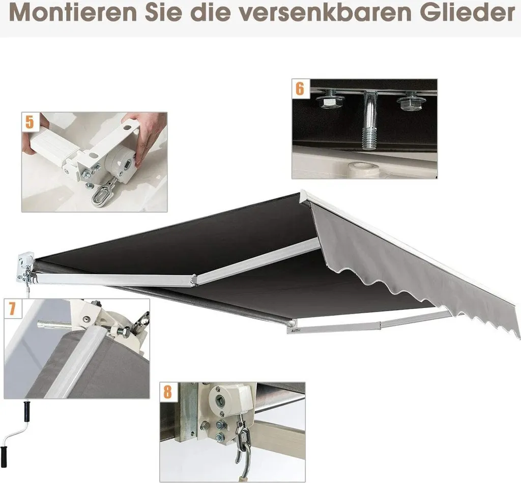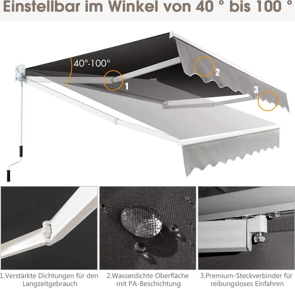 COSTWAY 2,5x2m Gelenkarmmarkise Sonnenmarkise Mit UV- & Wasserbeständigem Material, Aluminiumrahmen & -kurbel Grau