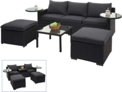 Poly-Rattan Garnitur HWC-F55, Balkon-/Garten-/Lounge-Set Sofa Sitzgruppe Schwarz, Kissen Dunkelgrau