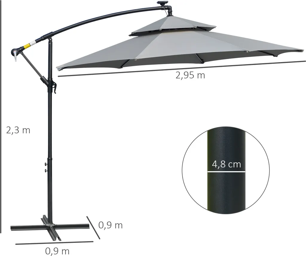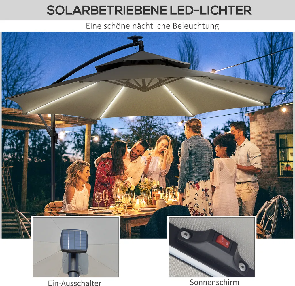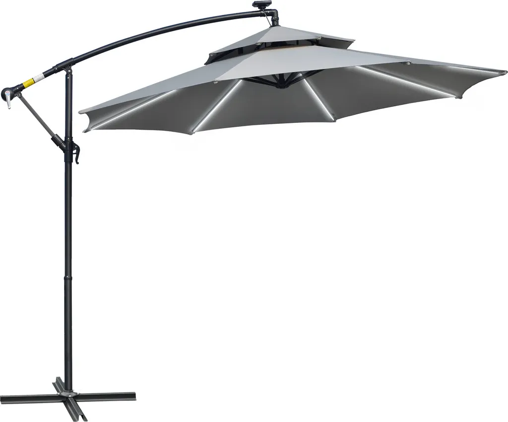 HOMCOM Outsunny Ampelschirm Ø295 Cm LED Solar Sonnenschirm Wasserabweisend Alu Hellgrau