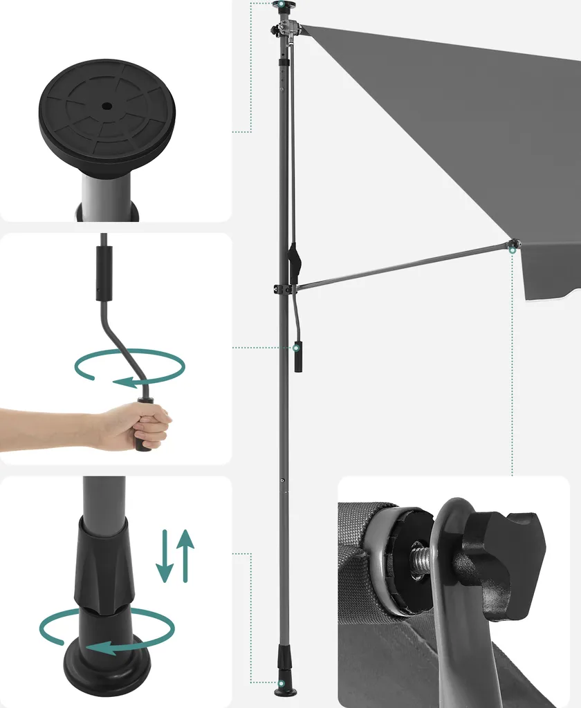 SONGMICS Balkonmarkise, 300 Cm, Alu-Klemmmarkise, 280 G/m² Polyester, Höhenverstellbar, Sonnenmarkise, Mit Handkurbel, Sonnenschutz, Für Balkon, Terrasse, Garten, Anthrazit GSA313G02