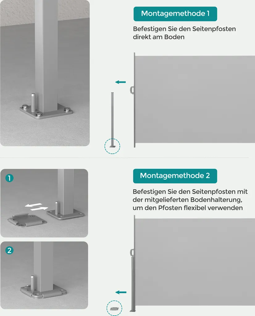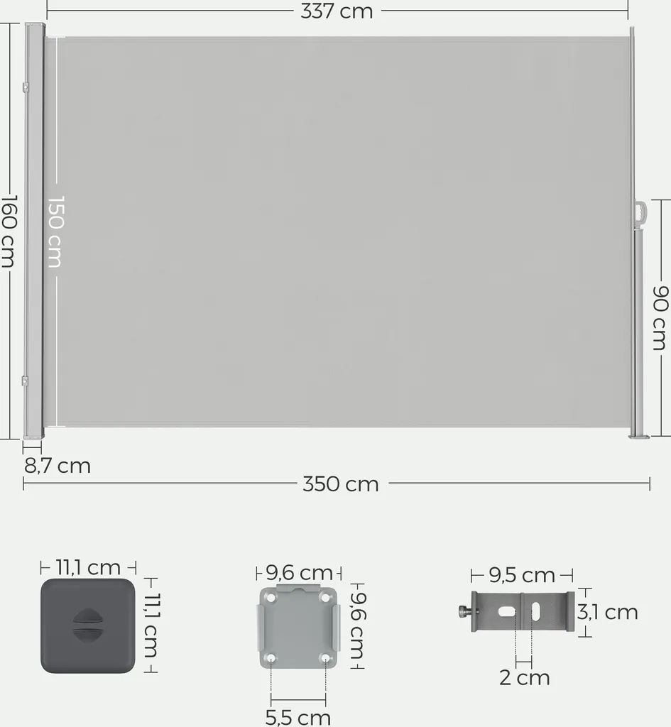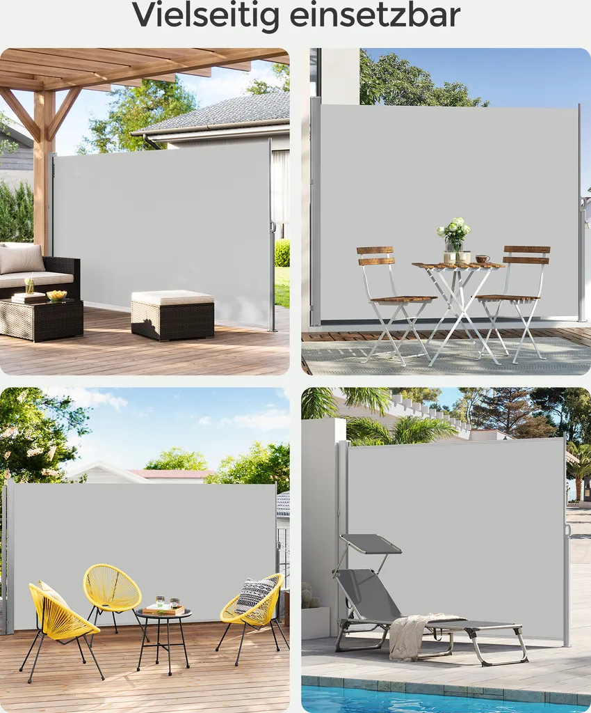 Schreibe die erste Rezension für „SONGMICS Seitenmarkise,Markise,160 X 350 Cm, Ausziehbar, Aus 220 G/m² Polyester, Sichtschutz, Sonnenschutz, Blickdicht, Seitenrollo, Für Balkon, Terrasse, Garten, Hellgrau ASG565G03“ Antwort abbrechen