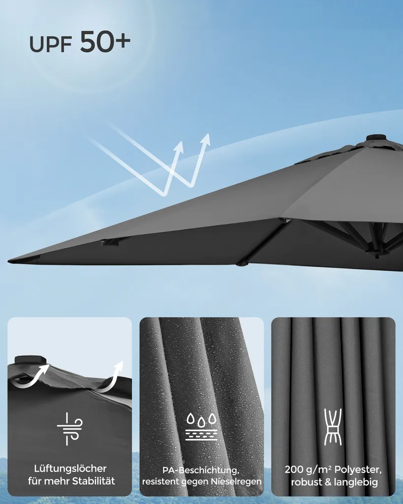 Schreibe die erste Rezension für „SONGMICS Sonnenschirm 290 X 290 Cm, UV-Schutz UPF 50+, Um 360° Drehbar, Mit Ständer, Befestigungsgurten Und Abdeckung, Rauchgrau GPU039G01“ Antwort abbrechen