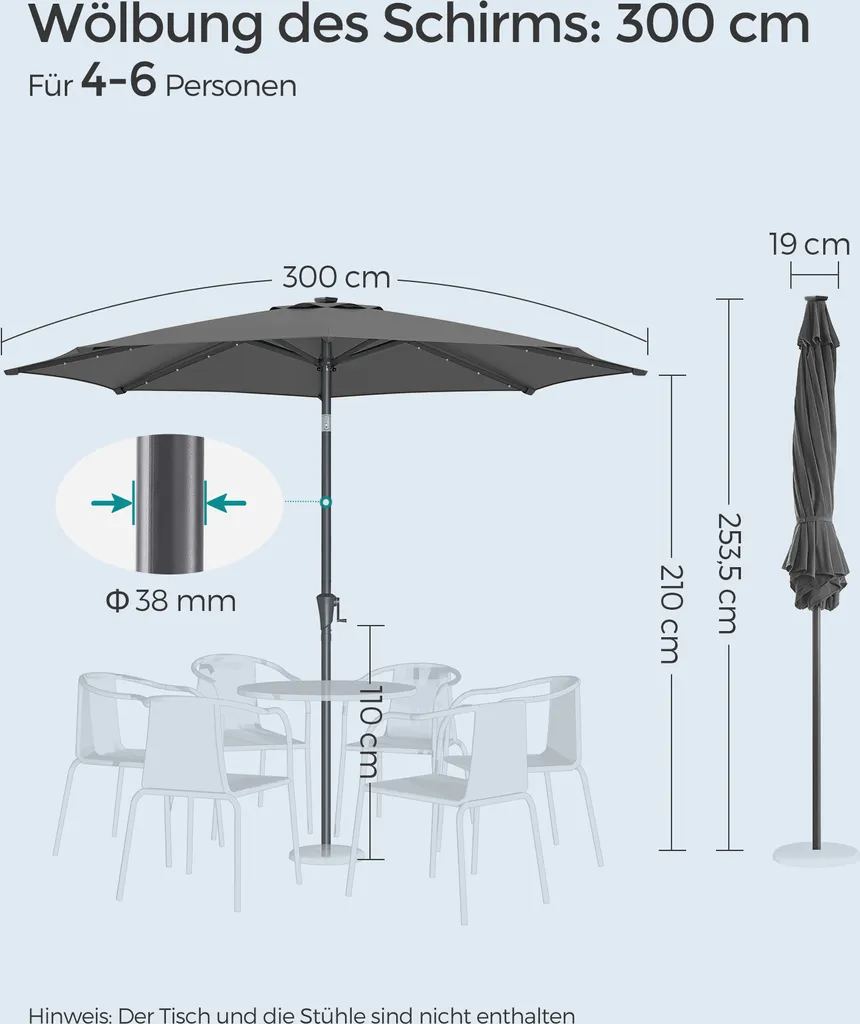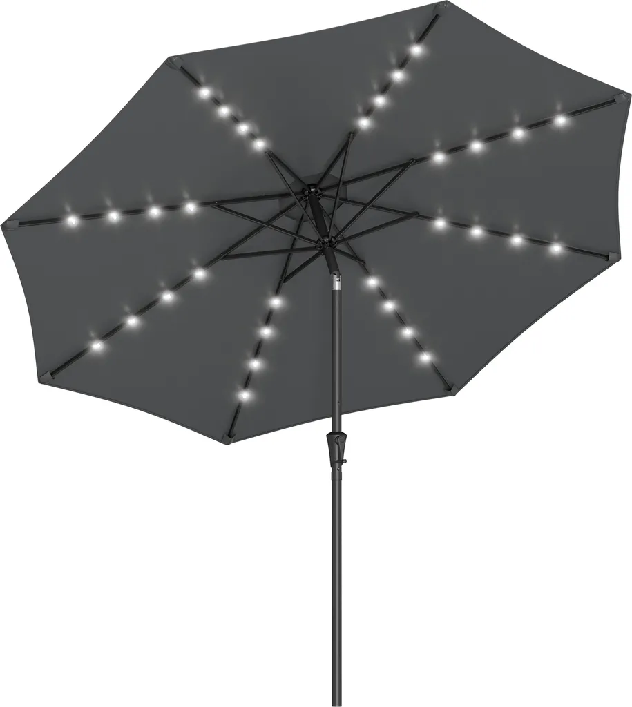 SONGMICS Sonnenschirm 300 Cm Mit LED-Solar-Beleuchtung, 32 LED-Lämpchen, UV-Schutz UPF 50+, Beidseitig Um 30° Knickbar, Ohne Ständer, Grau GPU33GY