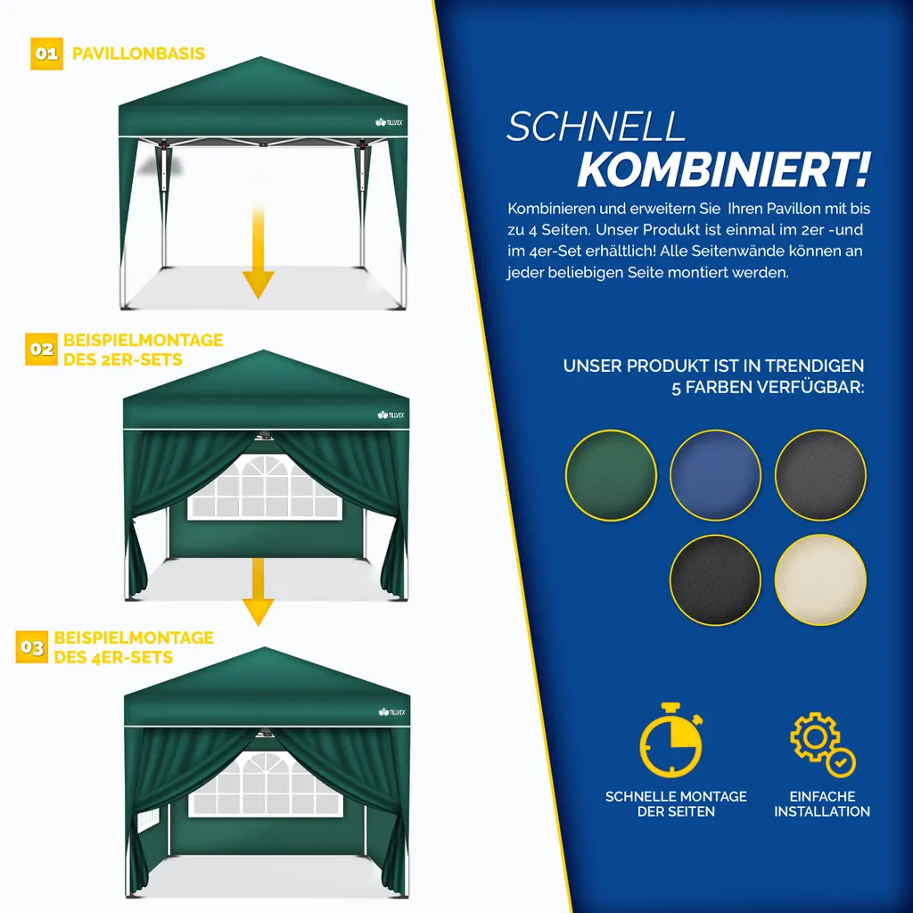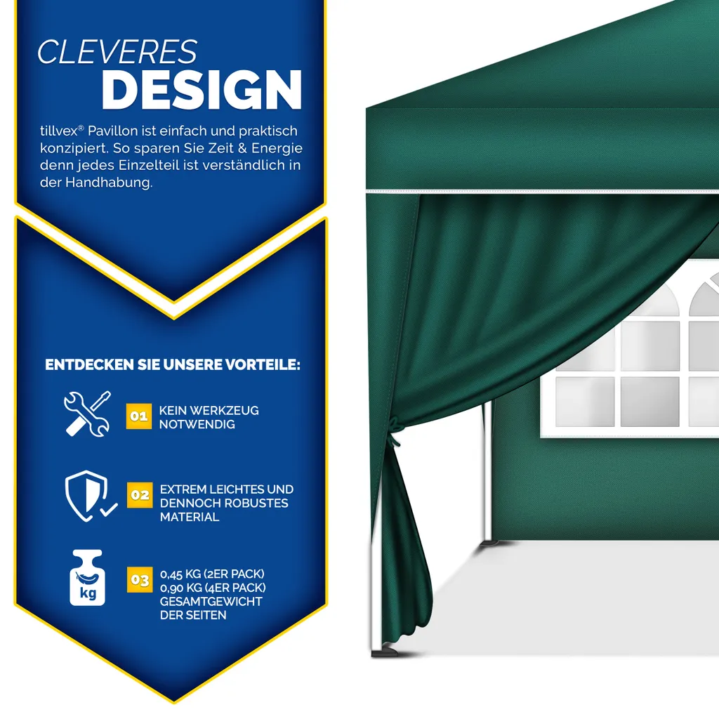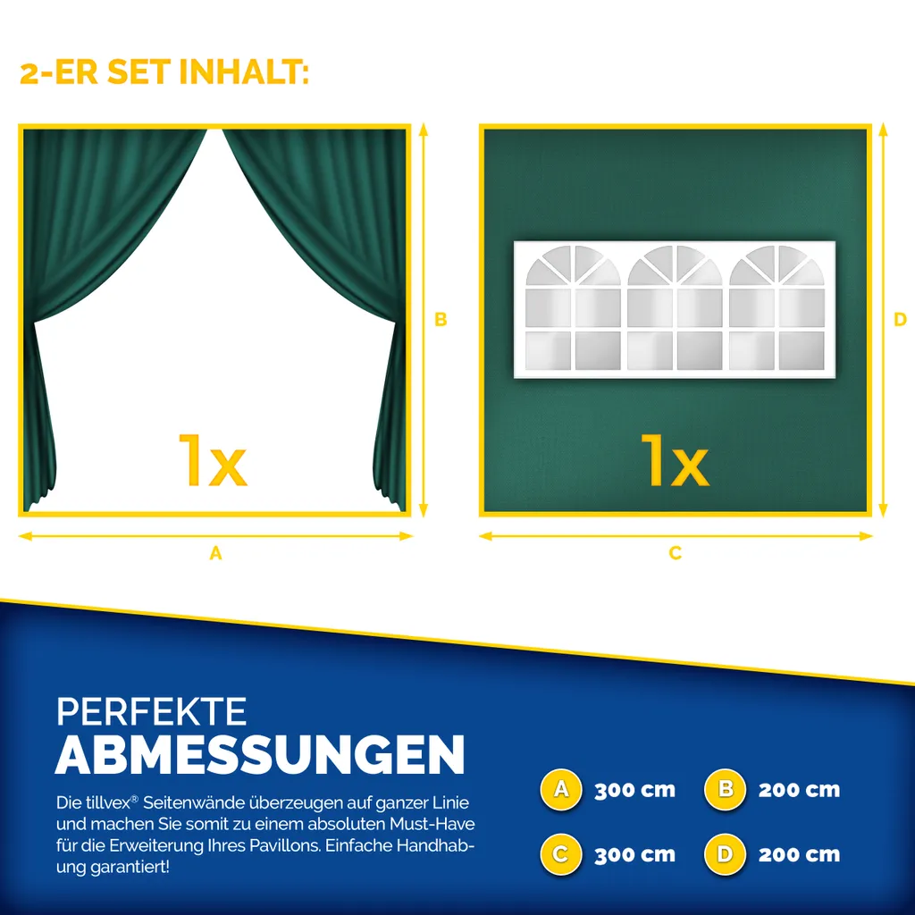 Tillvex® 2X Seitenwand Grün Für Pavillon 3x3m & 3x6m | Faltpavillon Seitenteile Wasserabweisend | Seitenfenster & Reißverschluss | Seitenwände Für Gartenzelt Partyzelt