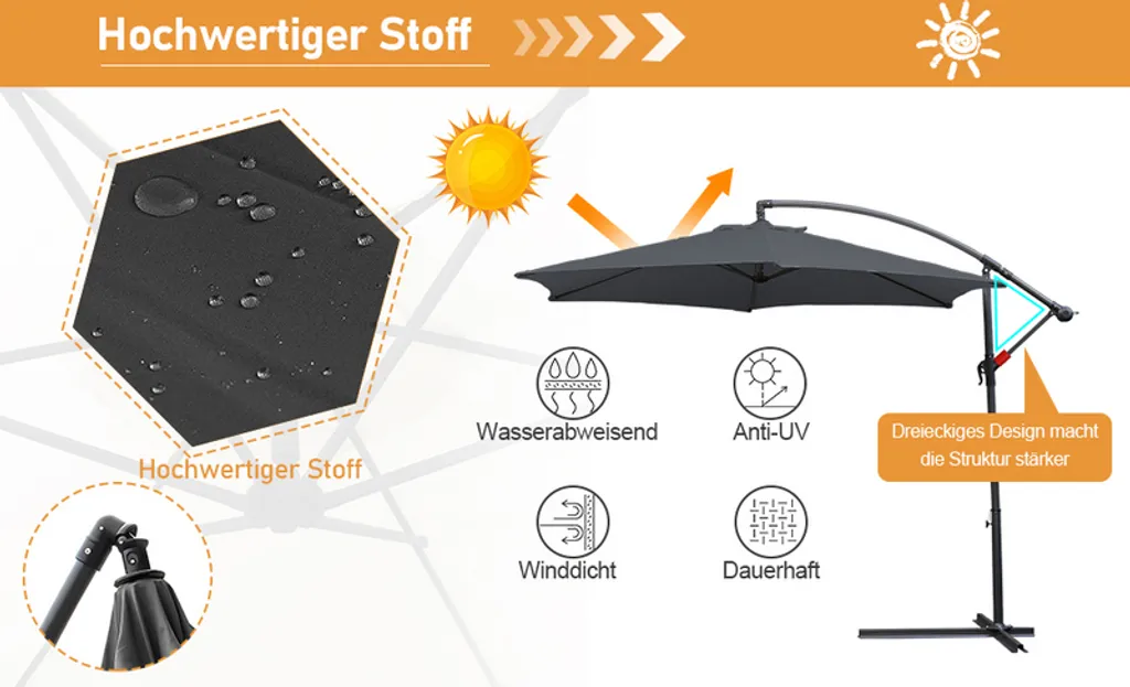 Schreibe die erste Rezension für „Wolketon 3m-3.5m Sonnenschirm Neigbar Ampelschirm Balkonschirm Marktschirm UV40+ Gartenschirm,Grau,3m“ Antwort abbrechen